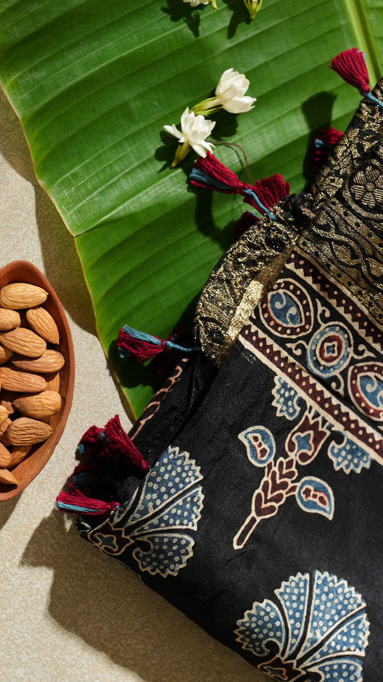 A timeless drape that brings together the depth of black and the richness of natural indigo, this Dola Silk Saree features a stunning fusion of traditional Ajrakh patterns with subtle floral motifs. Crafted with care and printed using heritage block-printing techniques, the fabric boasts a soft texture with a gentle sheen—perfect for evening wear, cultural gatherings, or festive celebrations.
