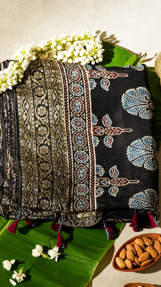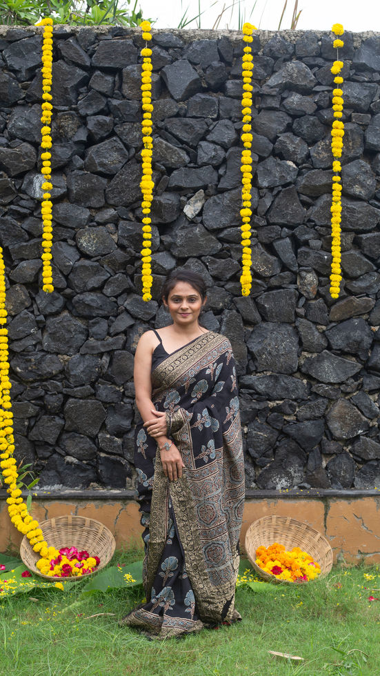 Black Dola Silk Saree with Indigo Ajrakh & Floral Print