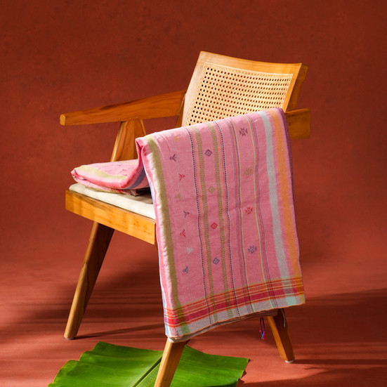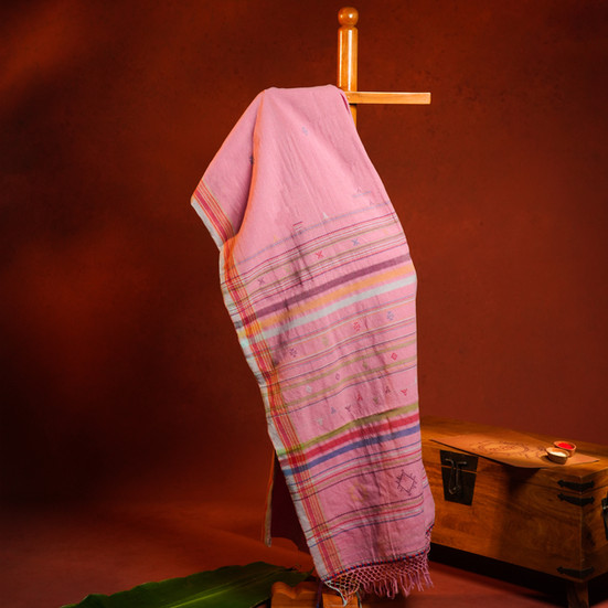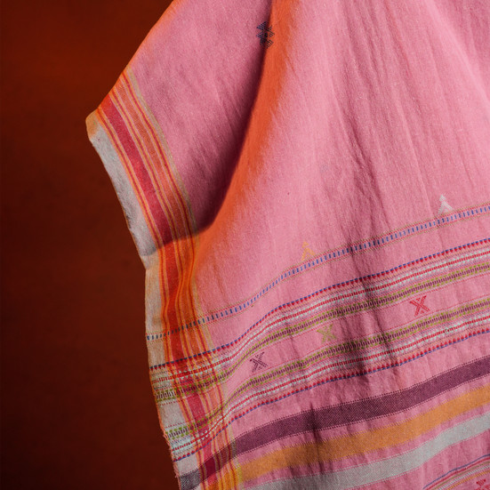 Komal Rekh is a baby pink kala cotton saree that speaks in gentle lines and subtle details. Handwoven using indigenous kala cotton, its delicate pastel base is elevated with fine woven stripes and understated handwork that add rhythm without overpowering the softness.