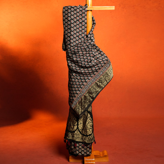 - Colour Palette: Black with indigo & maroon Ajrakh floral motifs
