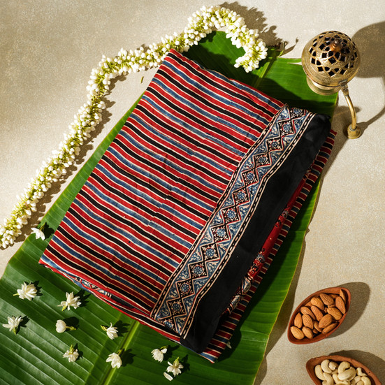 - Colour Story: Brick red base with black and indigo ajrakh stripes