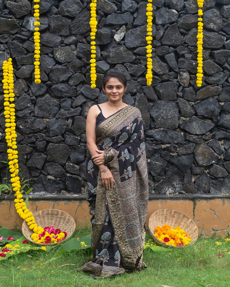 - Colour Palette: Black base with indigo floral Ajrakh print