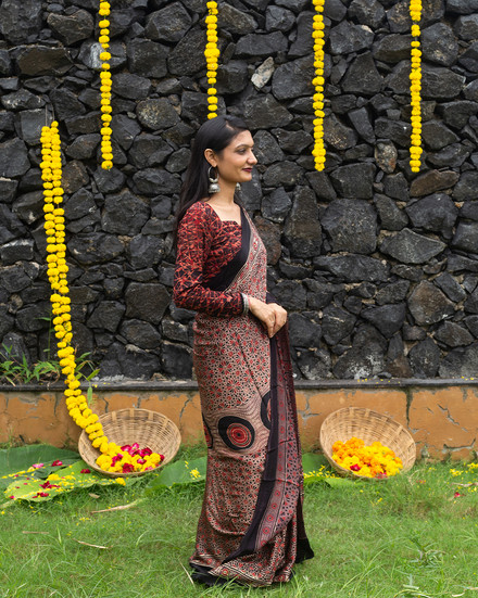 Brown Girl is a light brown modal silk saree layered with brick red prints and finished with a deep black border. Earthy yet bold, it carries a raw elegance that feels confident without trying too hard.