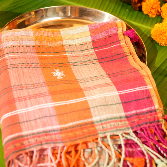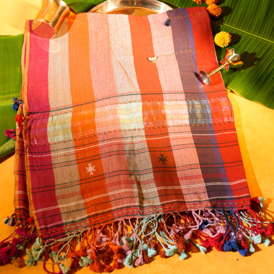 This vibrant multicolor cotton dupatta showcases exquisite handwoven craftsmanship paired with intricate handwork. The soft texture and charming tassels add a graceful touch, making it perfect for elevating any outfit with artisanal elegance.