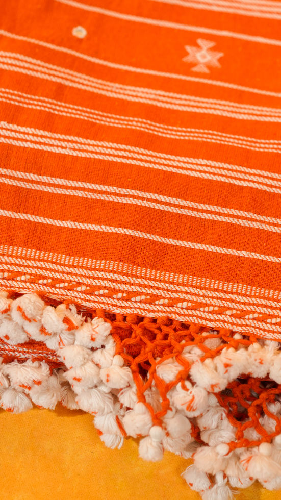 Vibrant and artisanal, this Orange Cotton Dupatta is meticulously handwoven and adorned with delicate handwork. Its soft texture and playful tassels add a charming finish, making it an ideal accessory to brighten up any outfit.