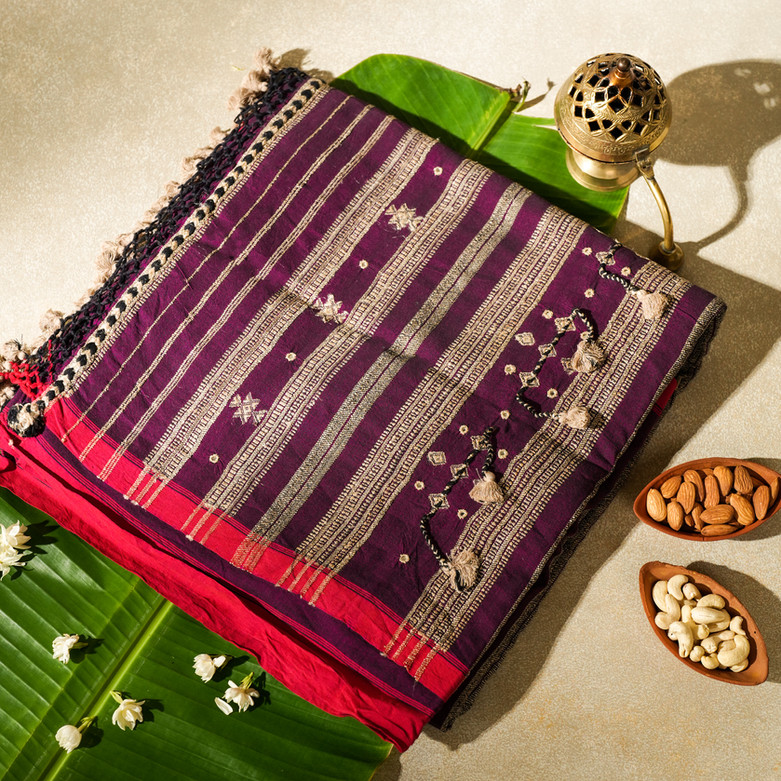 Rumi is a handwoven cotton–tussar silk saree where texture and rhythm meet. The deep purple base is accented with fine handwork and flowing woven lines, creating depth without overpowering the design.