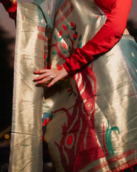 Style Tip:- Style Resham Rang with a contrast silk or brocade blouse in rani pink,red or maroon, peacock blue and antique gold, traditional gold jewellery, a sleek bun adorned with gajra, and softly defined eyes for a timeless Paithani-inspired look.