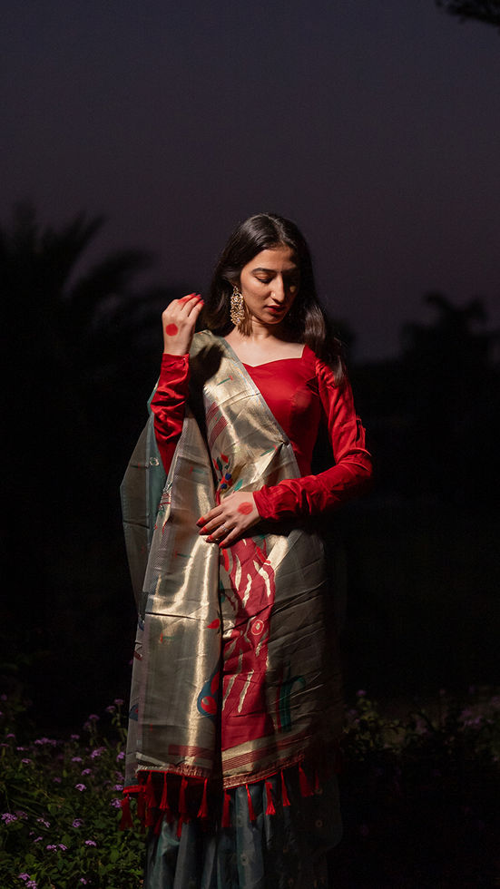 Style Resham Rang with a contrast silk or brocade blouse in rani pink,red or maroon, peacock blue and antique gold, traditional gold jewellery, a sleek bun adorned with gajra, and softly defined eyes for a timeless Paithani-inspired look.