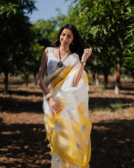 - Colour Palette: Soft, neutral body with a sunflower-printed pallu — warm, cheerful & grounding