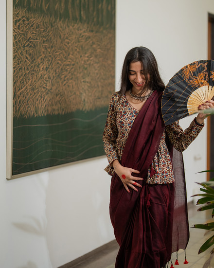 Style Tip:- Pair Wine Fall with a beige, antique gold, or soft blush blouse, statement oxidised or gold-toned jewellery, a deep-toned lip, and sleek hair in a low bun or soft waves for a refined, evening-ready look.