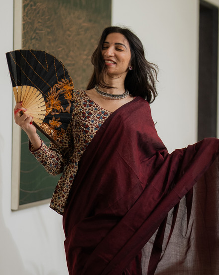 Deep, warm, and effortlessly elegant, Wine Fall is a maroon Khadi cotton saree that captures the richness of earthy hues and slow-crafted beauty. Hand-spun and thoughtfully woven, this saree flows with quiet sophistication—perfect for those who love bold colours softened by natural textures.