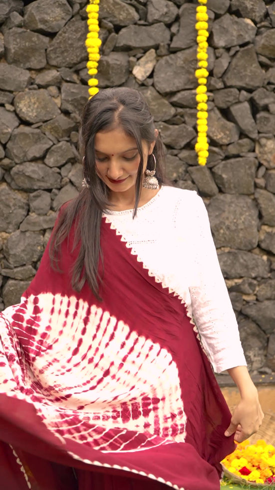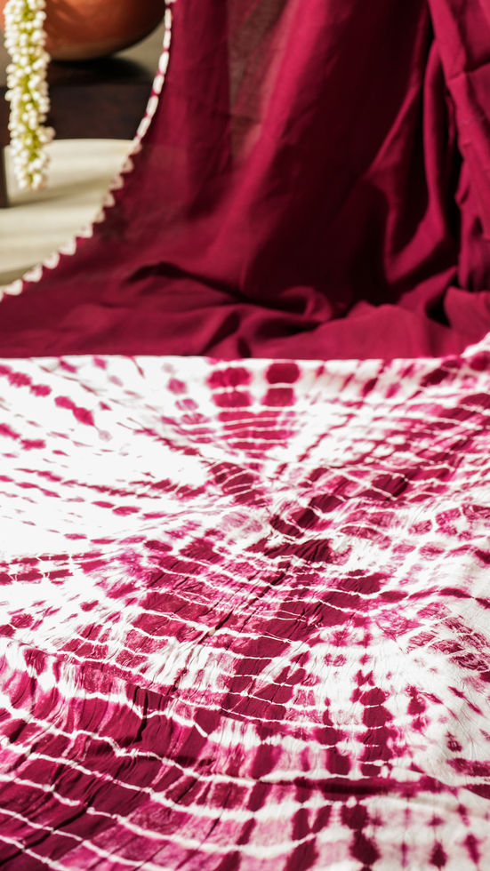 Drenched in rich wine red hues, this Modal Silk Saree features a stunning Shibori print—a traditional resist-dyeing technique that creates unique, flowing patterns across the fabric. With a soft, fluid texture and natural sheen, the saree gracefully blends artisanal charm with everyday sophistication. Lightweight yet luxurious, it’s perfect for daywear elegance or quiet evening glamour.